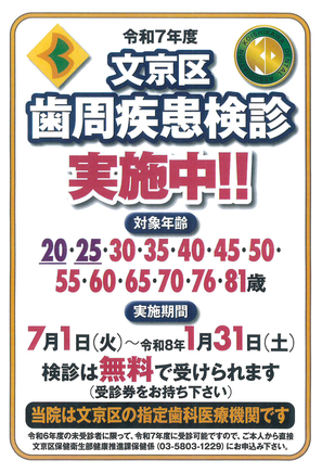 当院は、令和7年度における文京区の歯周疾患健診の対象医療機関です。